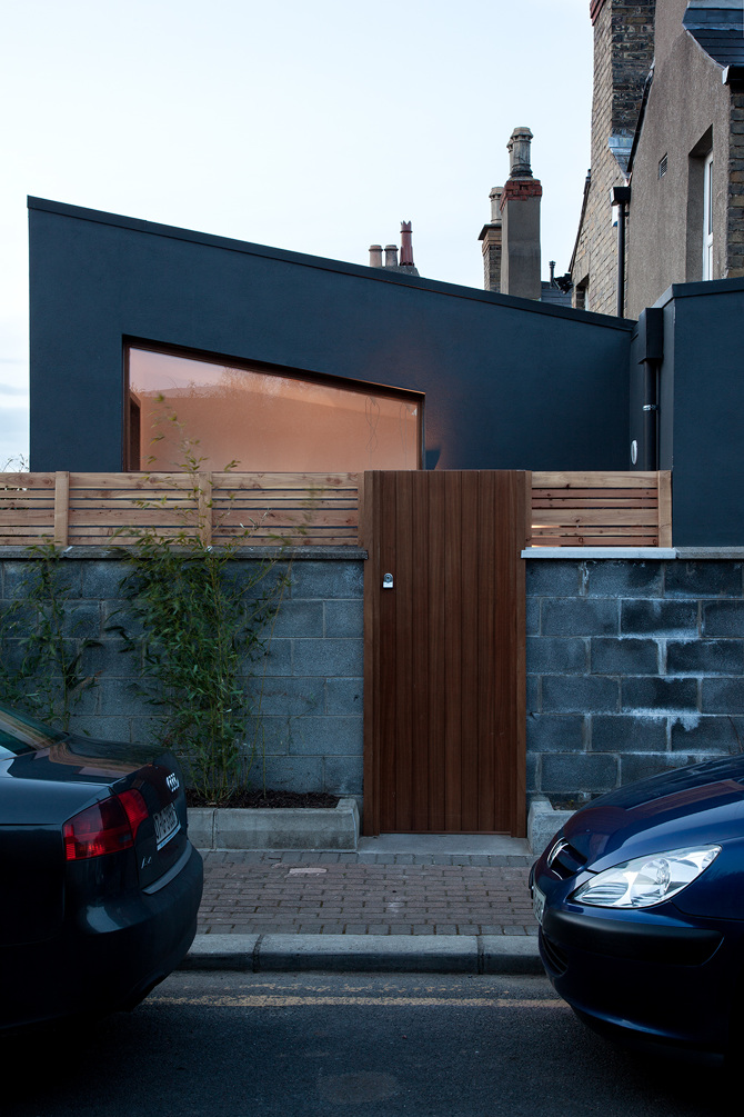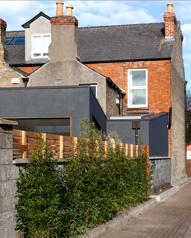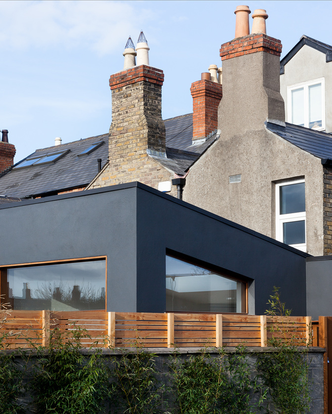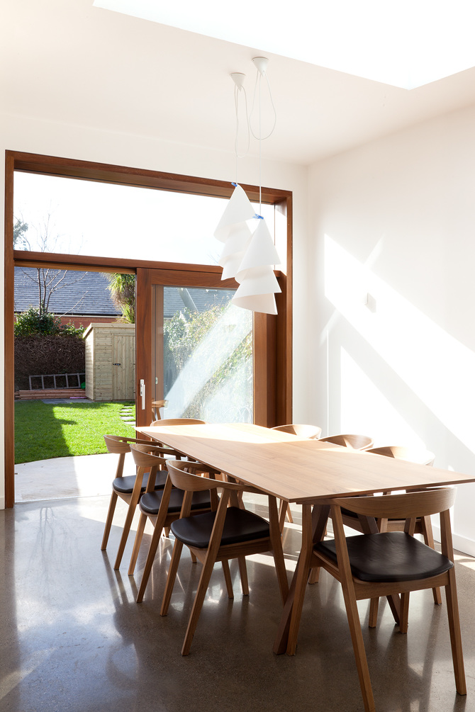 The extension’s contemporary expression is in conversation with the existing house through the materials used; dark render echoes the slate roof; warm iroko timber repeats the tones of the original brickwork. A polished concrete floor is laid inside and out, allowing continuity from interior to exterior.