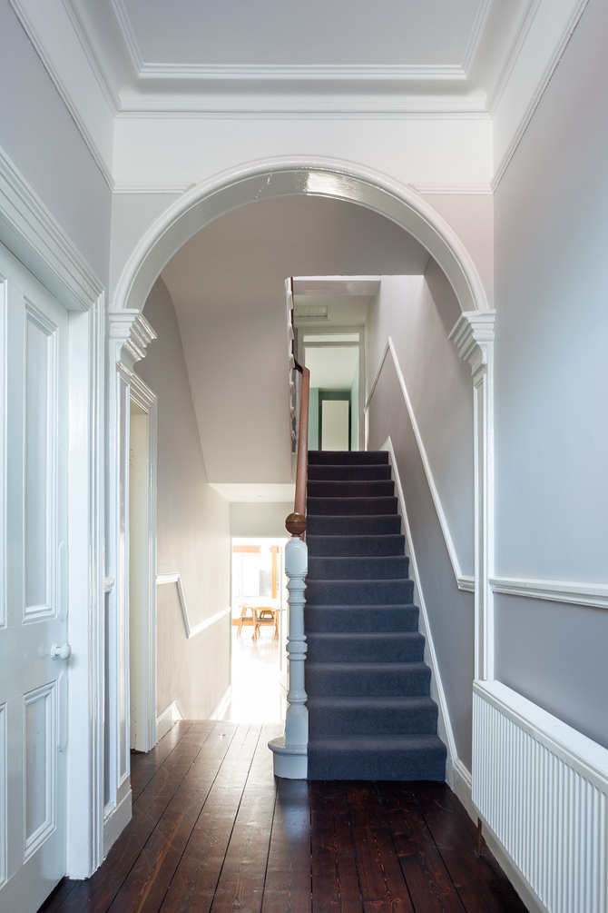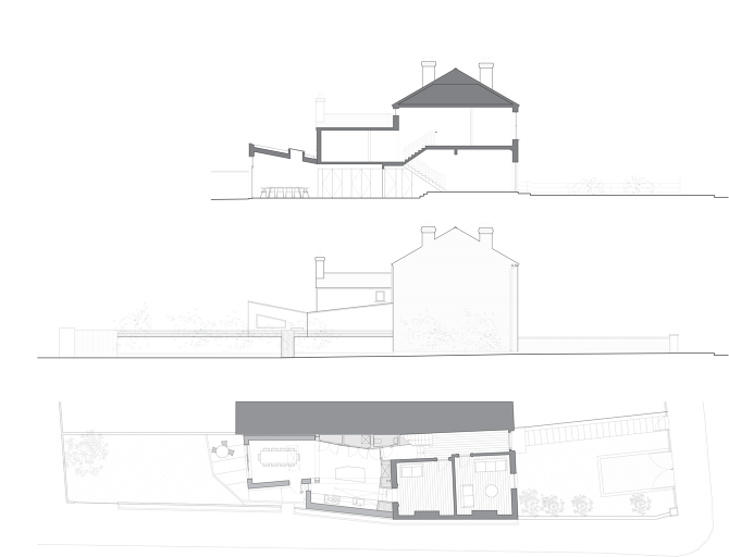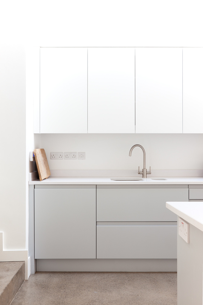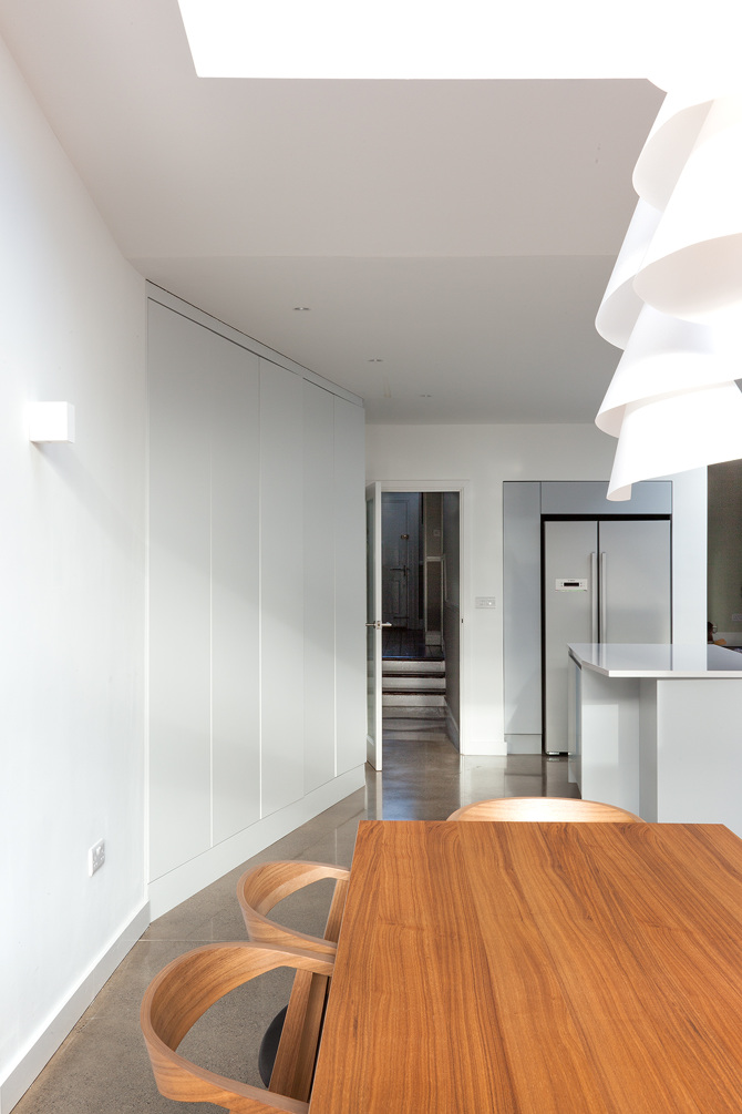The off-square geometries of the original Victorian house were responded to in plan and section in this kitchen and dining extension. The storage wall undulates to enclose all the working of a family house, while the roof line bends down and back up again to reach out to the light of the garden.