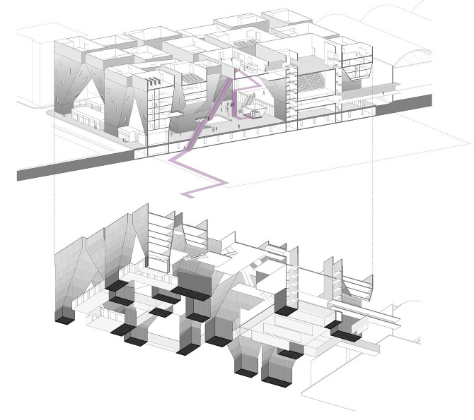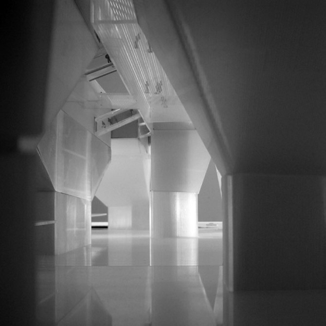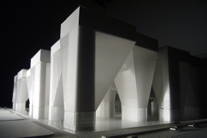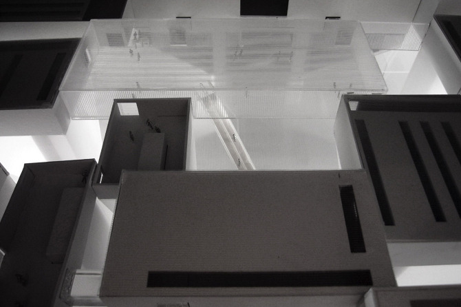 A theoretical project for a new conference centre and hotel in Philadelphia that investigated the method of using differences productively, tested its hypothesis through the specific problem of connecting two contrasting horizontally extensive plans, one at roof level, the other at ground level. The structural inversion from columns at ground level to ‘cells’ or rooms at roof level produces 32 tapering towers housing the hotel rooms that overlook the convention centre floor below. The programmatic consequence of this exploited duality is a multivalency of occupation; the urban and the intimate become connected by a new roof structure for the city.